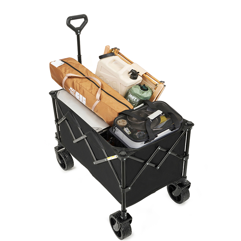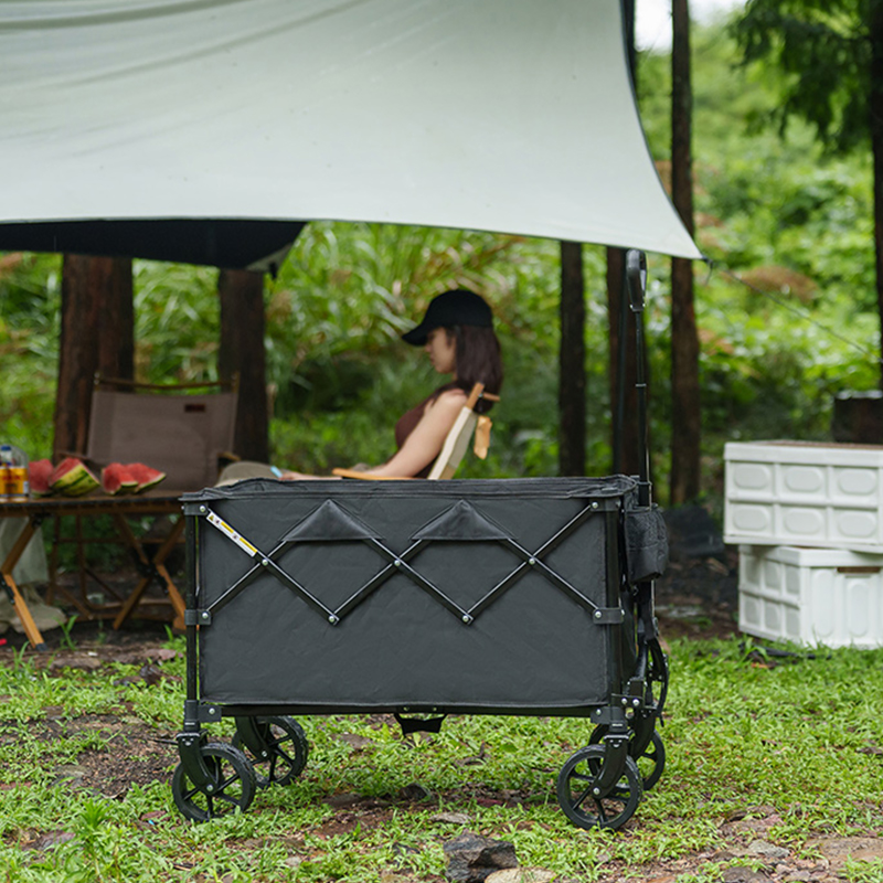 キャンプ道具やピクニック用品などをまとめて運べる大容量タイプで、折りたたむとコンパクトになり、車載もしやすい設計です。